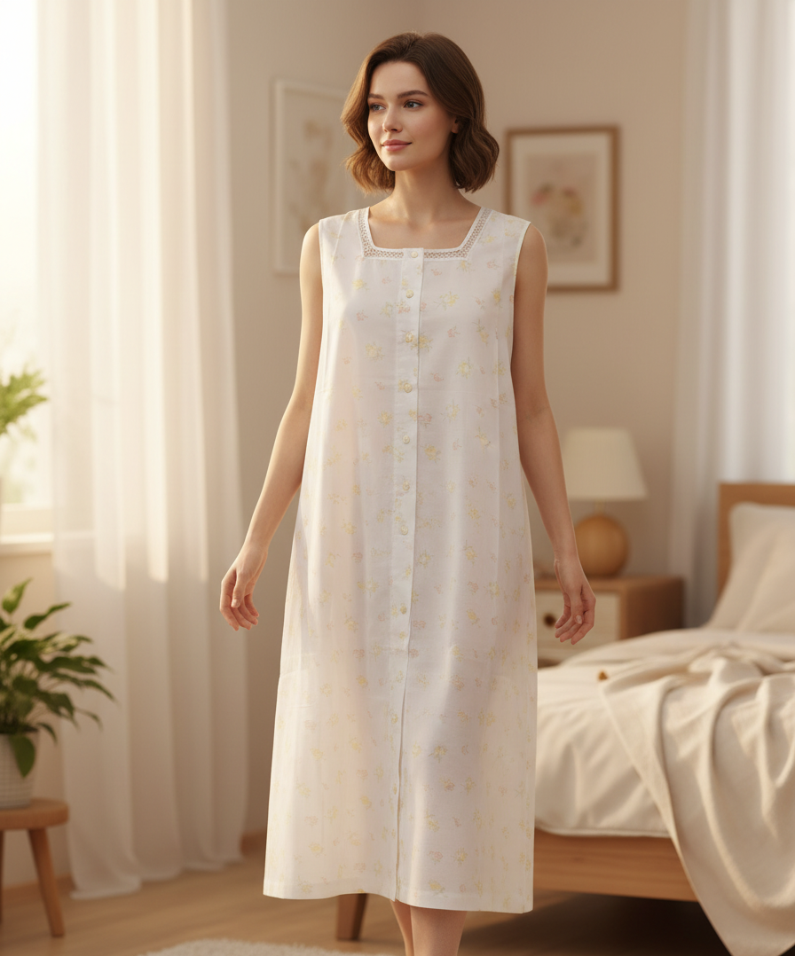 Νυχτικό με μάκρος κάτω από το γόνατο, από ποπλίνα(βατίστα),με πρακτική πατιλέτα πέντε κουμπιών, ανάλαφρο και δροσερό.