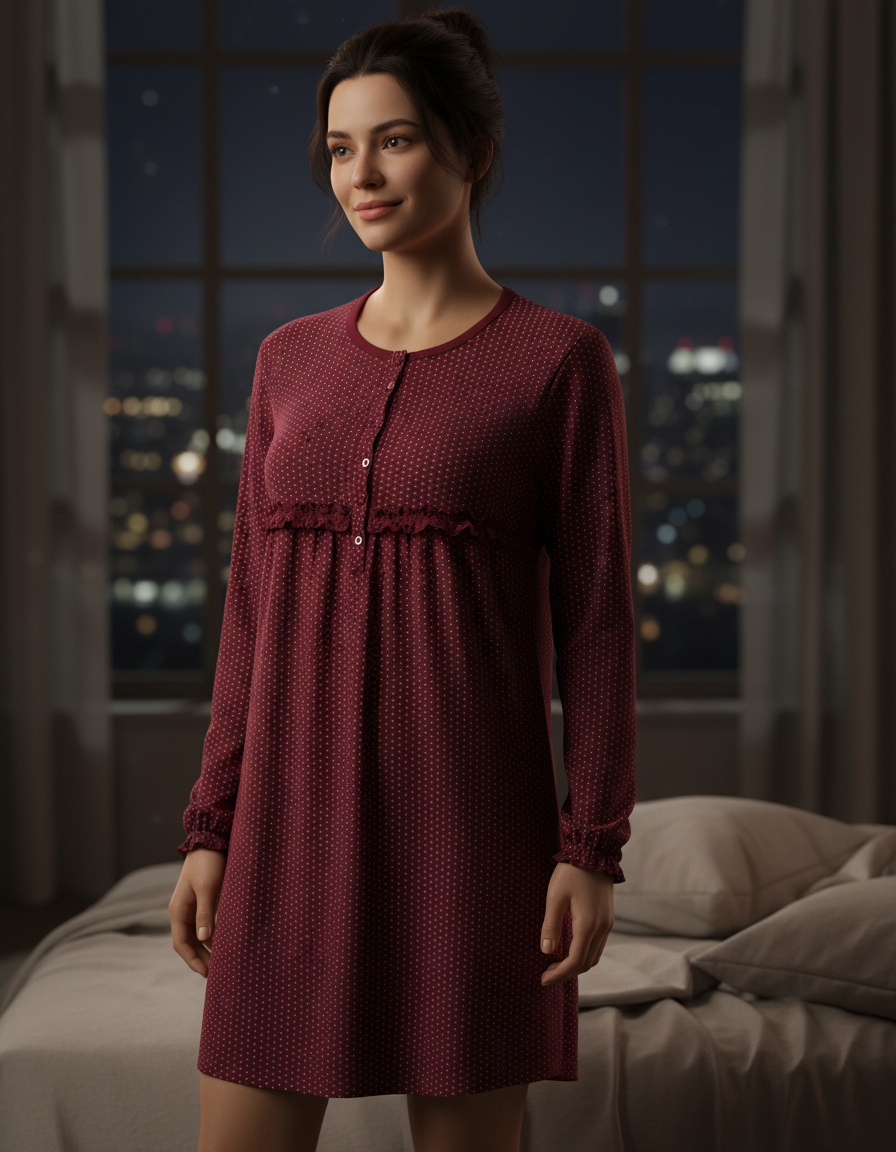 Βαμβακερό μακρυμάνικο Νυχτικό AMELIE Homewear 174969, μπορντώ.