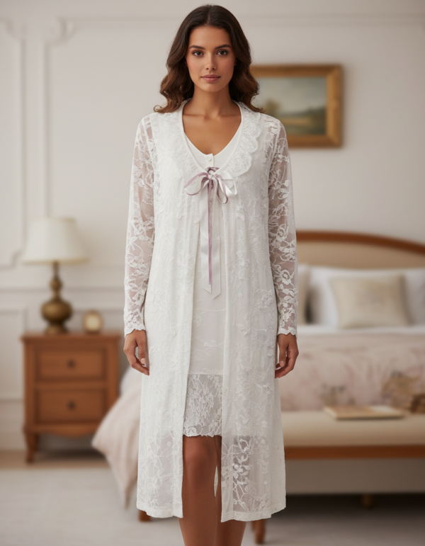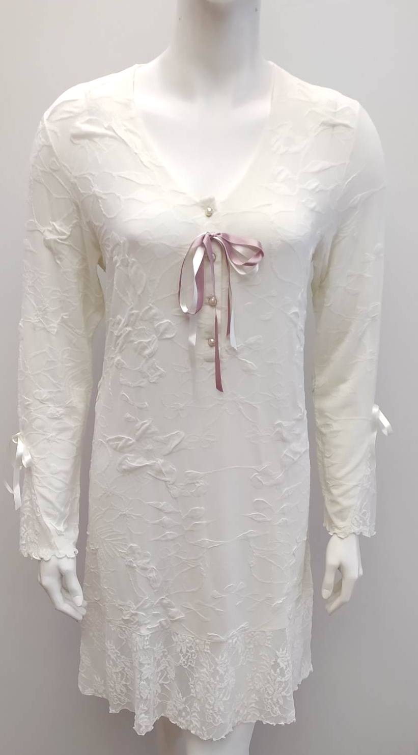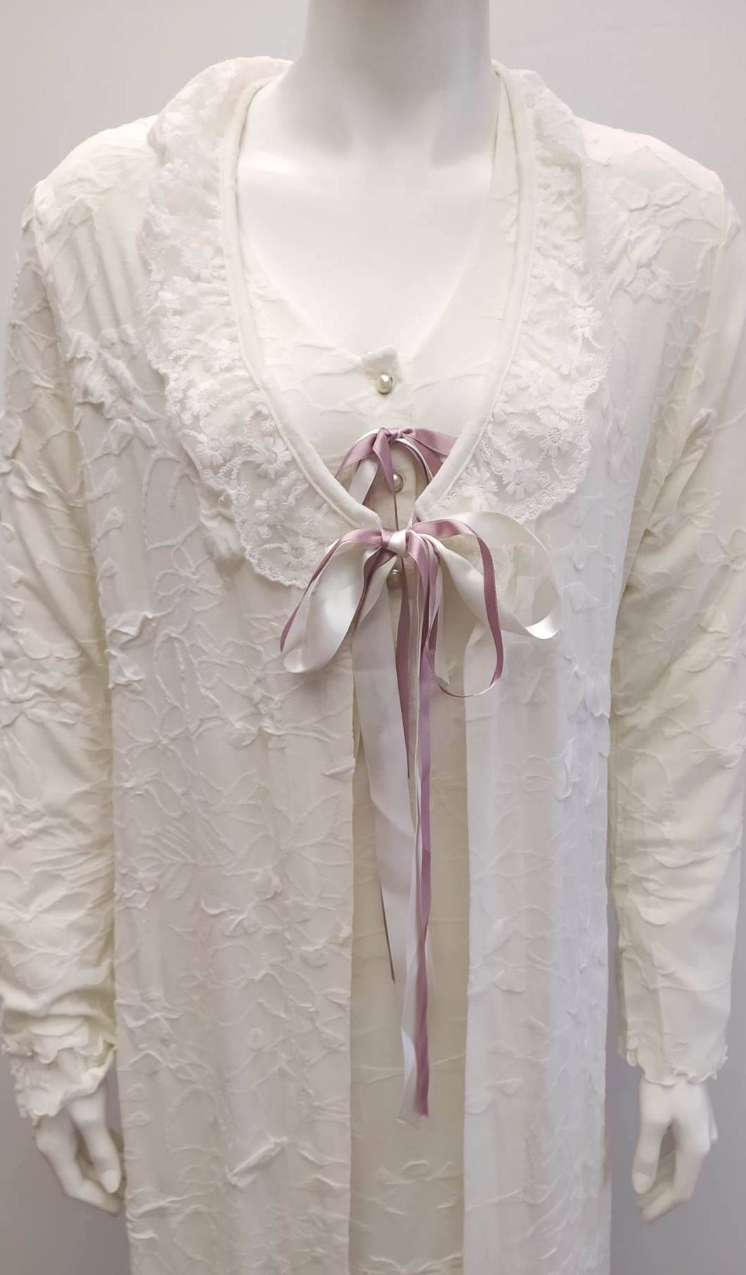 Υπέροχο σετ αποτελούμενο από μακρυμάνικο Νυχτικό με μήκος μέχρι το γόνατο,εσωτερικό ανάγλυφο σχέδιο,πατιλέτα τεσσάρων κουμπιών και όμορφο φιόγκο στο μέσον του στήθους ΚΑΙ Ρόμπα με δαντέλα στα τελειώματα της και κομψό,δετό φιόγκο με τον οποίο ενώνεται.